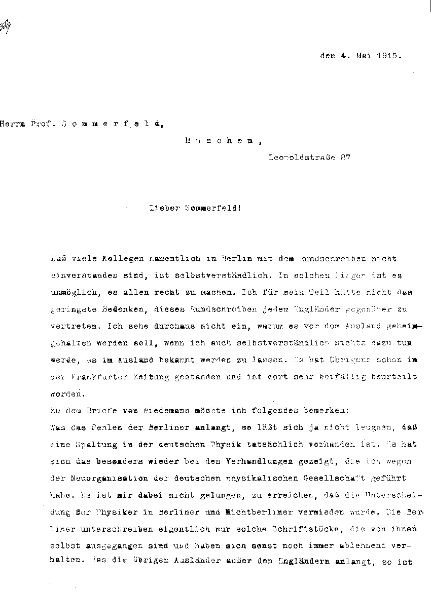 Wilhelm Wien an Arnold Sommerfeld, 4. Mai 1915