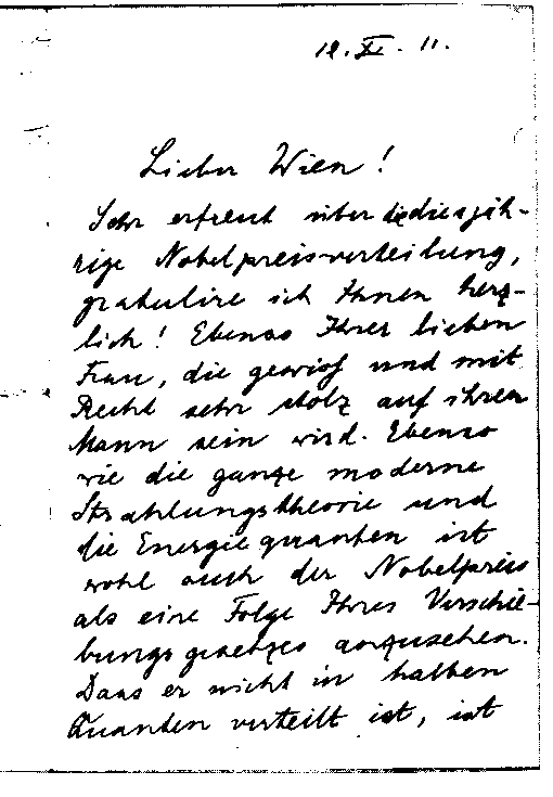 AS gratuliert Wien zum Nobelpreis; Wortspielerei mit Quanten; fragt nach »Solvay-Photographien«.