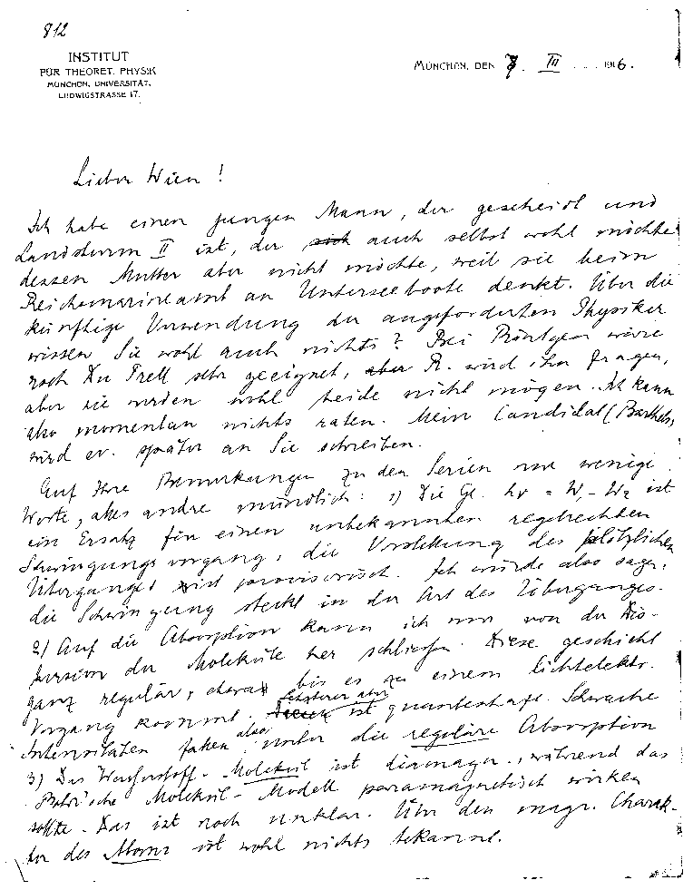 Arnold Sommerfeld an Wilhelm Wien, 7. März 1916