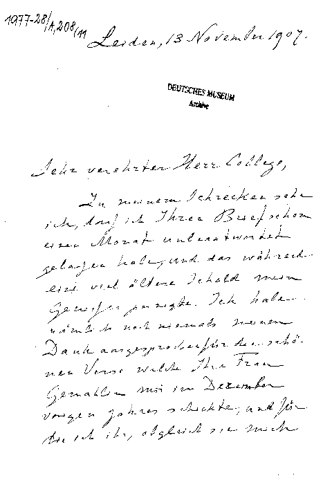 Hendrik A. Lorentz an Arnold Sommerfeld, 13. November 1907