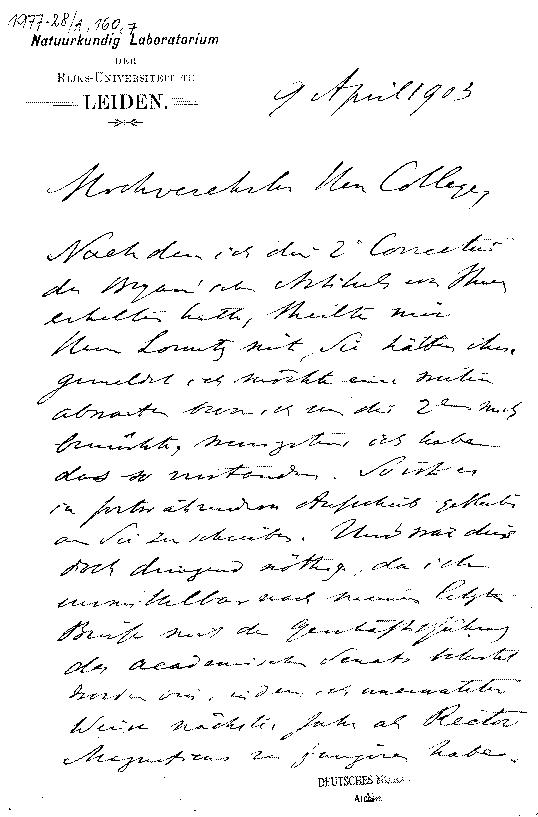 Heike Kamerlingh Onnes an Arnold Sommerfeld, 9. April 1903