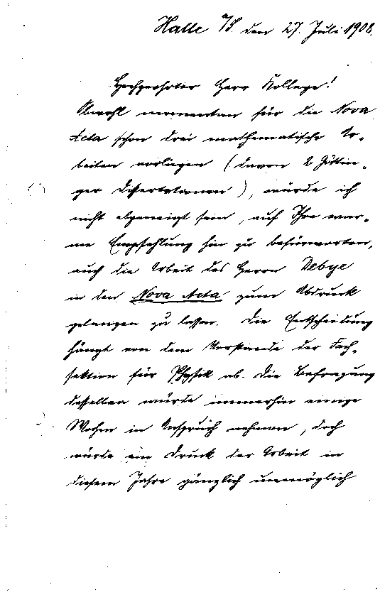 Wangerin sagt Abdruck einer Arbeit Debyes in den Nova Acta zu, aber frühestens im kommenden Jahr.