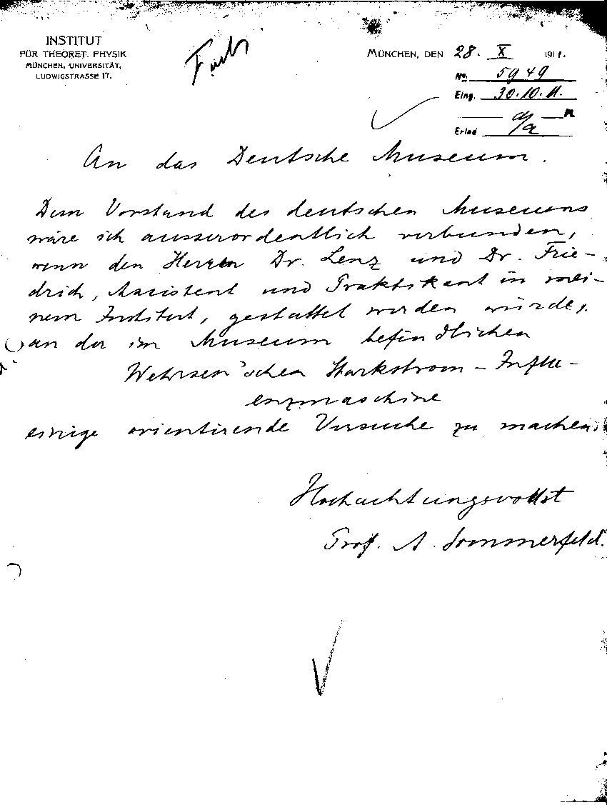 Arnold Sommerfeld an Deutsches Museum, Vorstandsrat, 28. Oktober 1911