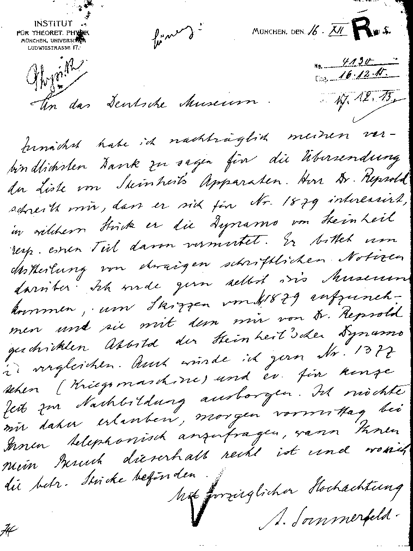 Arnold Sommerfeld an Deutsches Museum, Vorstandsrat, 16. Dezember 1915