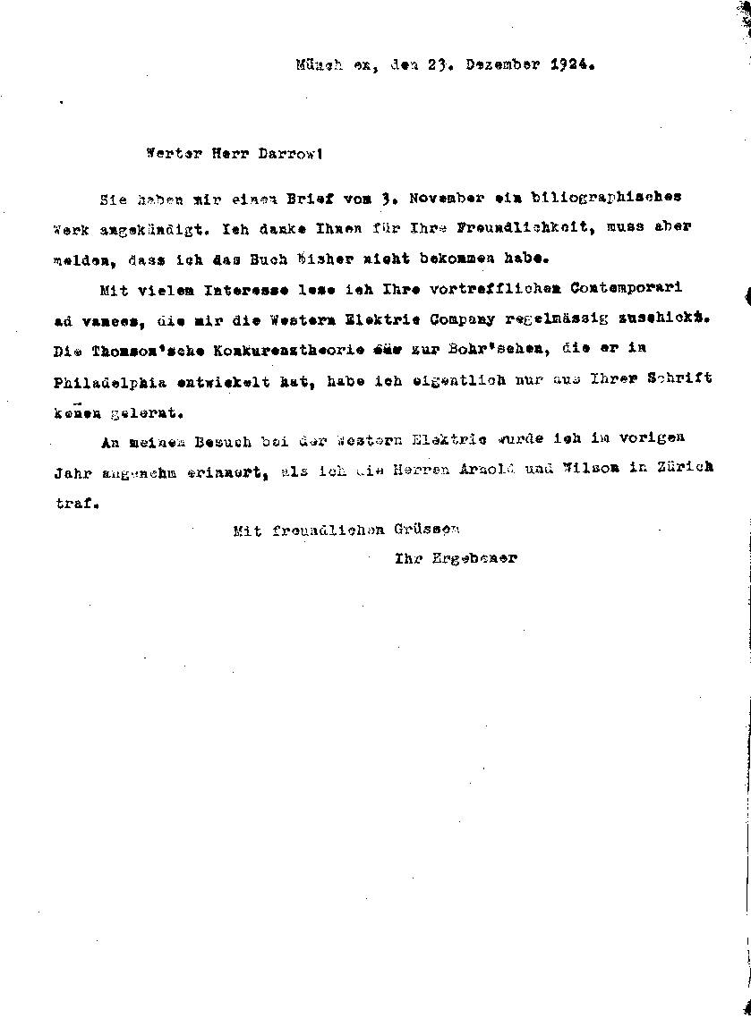 Arnold Sommerfeld an Karl K. Darrow, 23. Dezember 1924