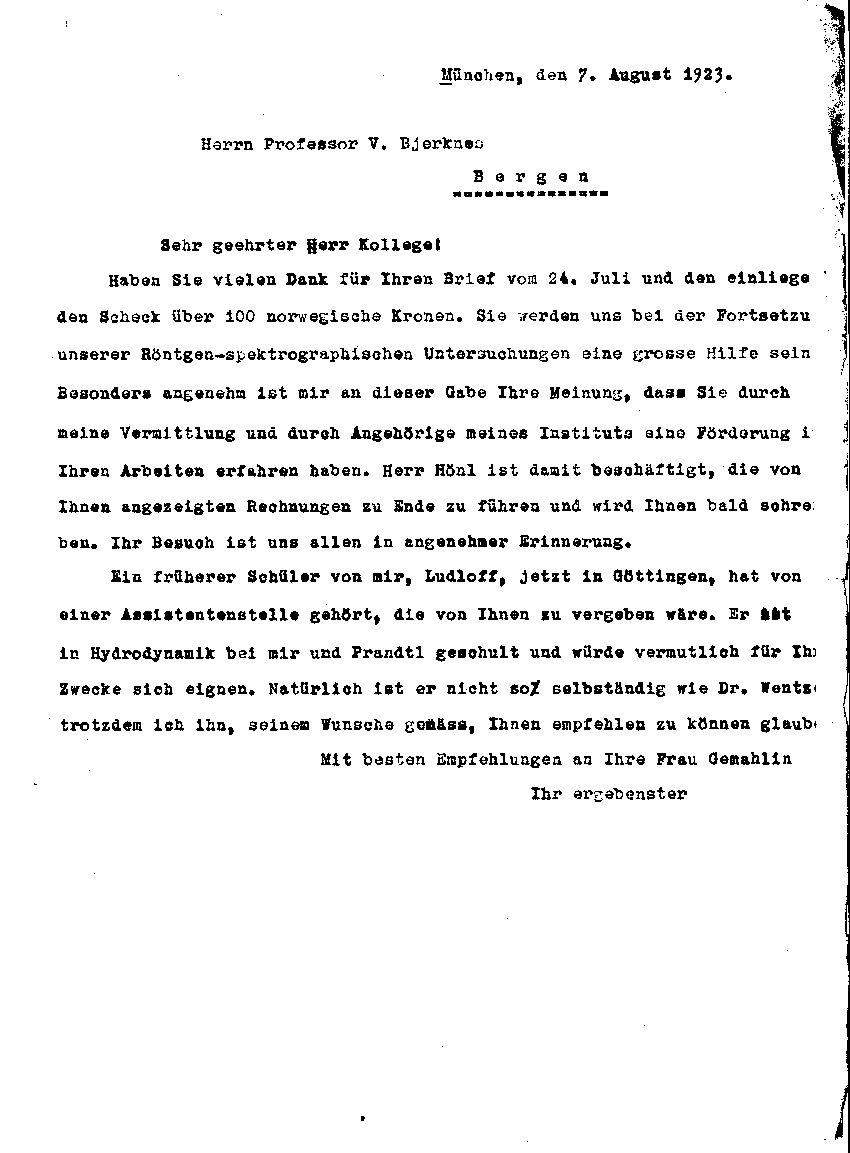 Arnold Sommerfeld an Vilhelm Bjerknes, 7. August 1923