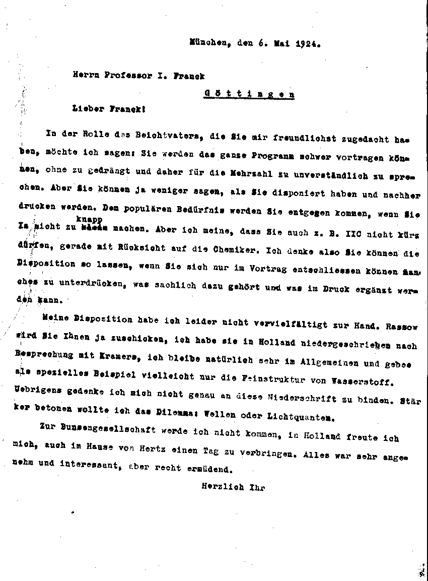Arnold Sommerfeld an James Franck, 6. Mai 1924