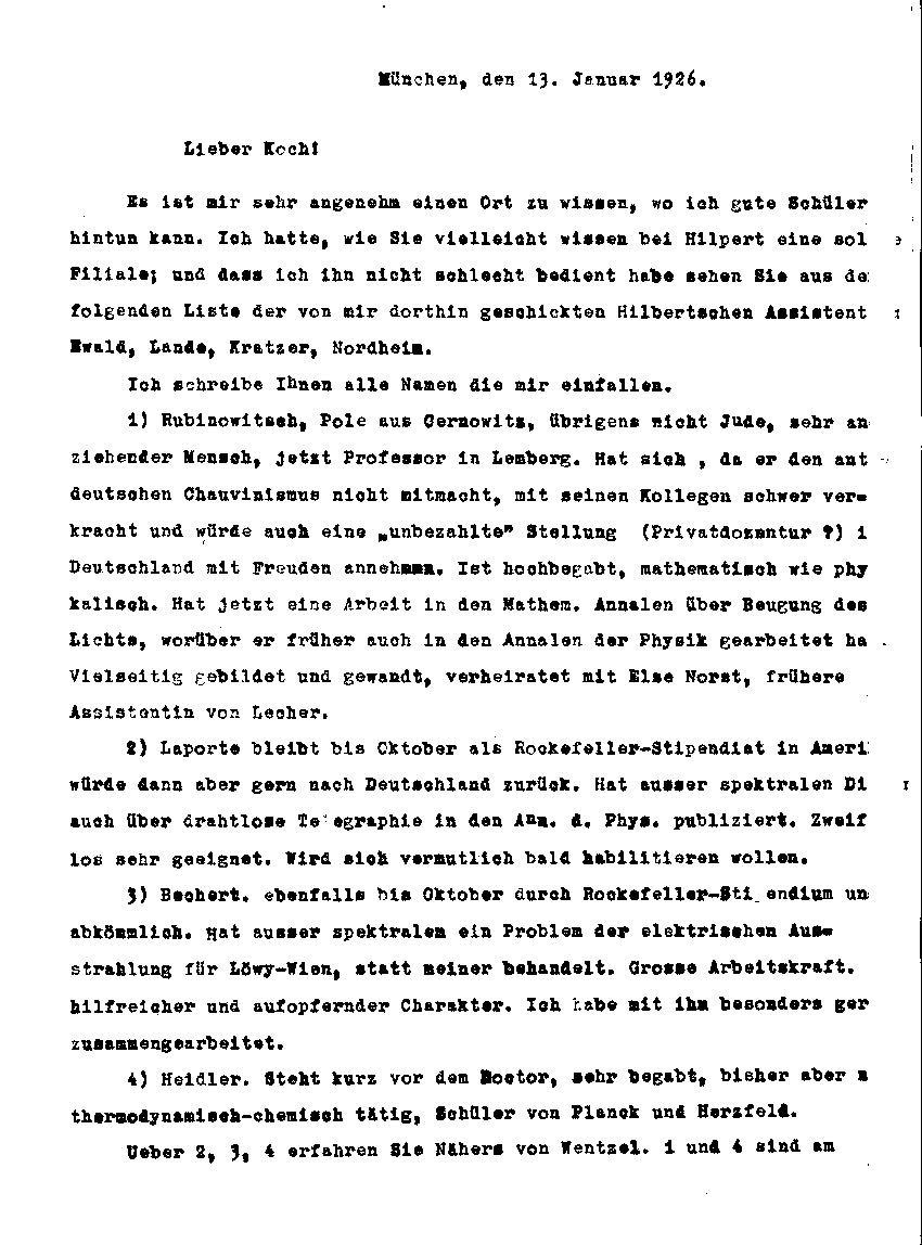 Arnold Sommerfeld an Peter Paul Koch, 13. Januar 1926
