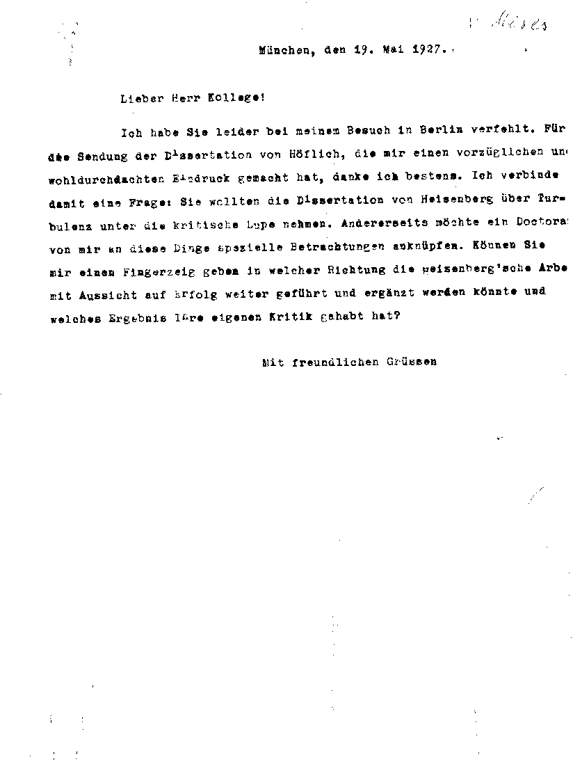 Arnold Sommerfeld an Richard von Mises, 19. Mai 1927