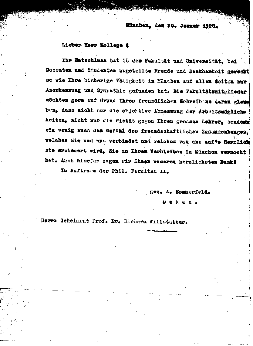 AS dankt als Dekan Willstätter für seinen Entschluß, in München zu bleiben.