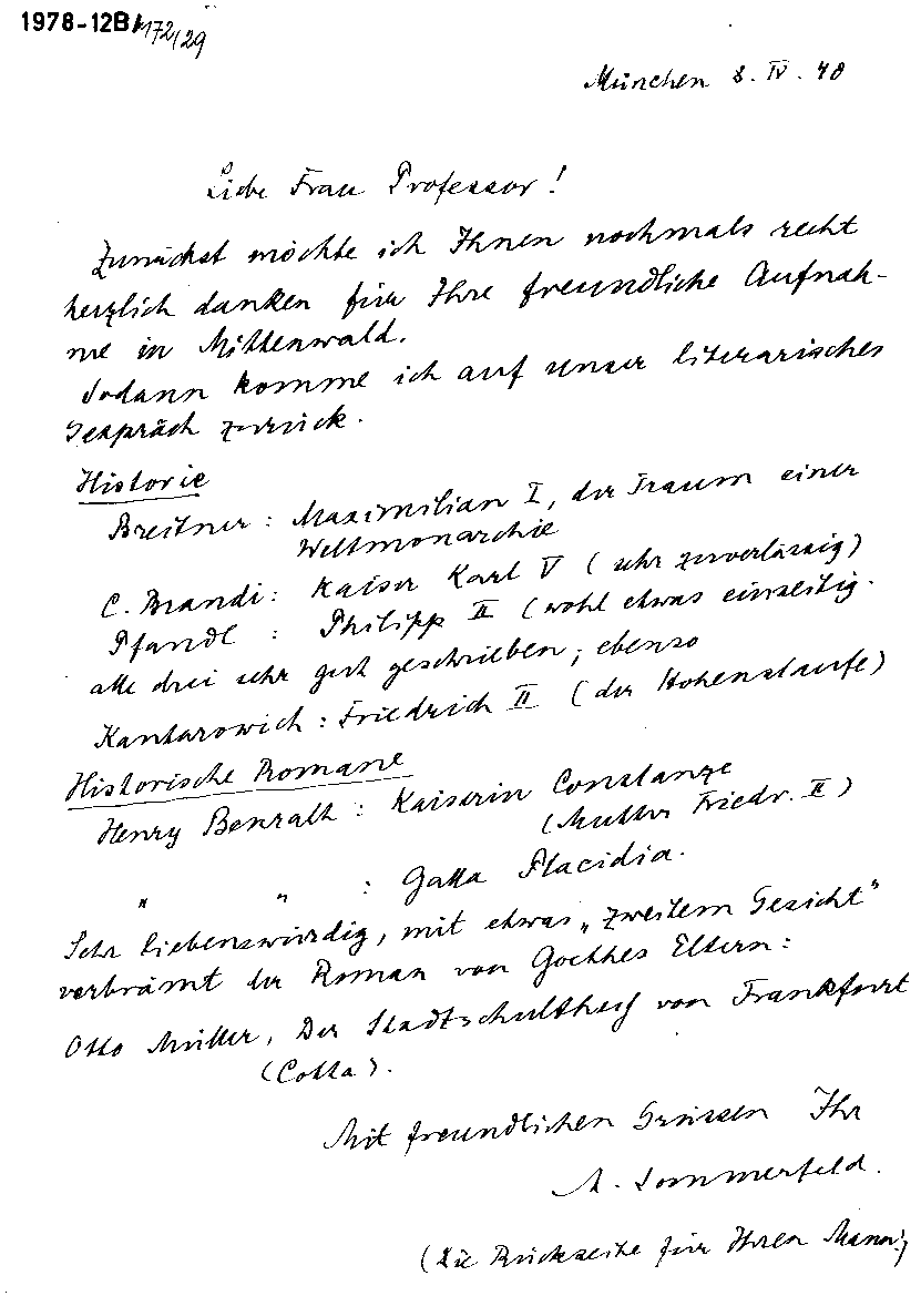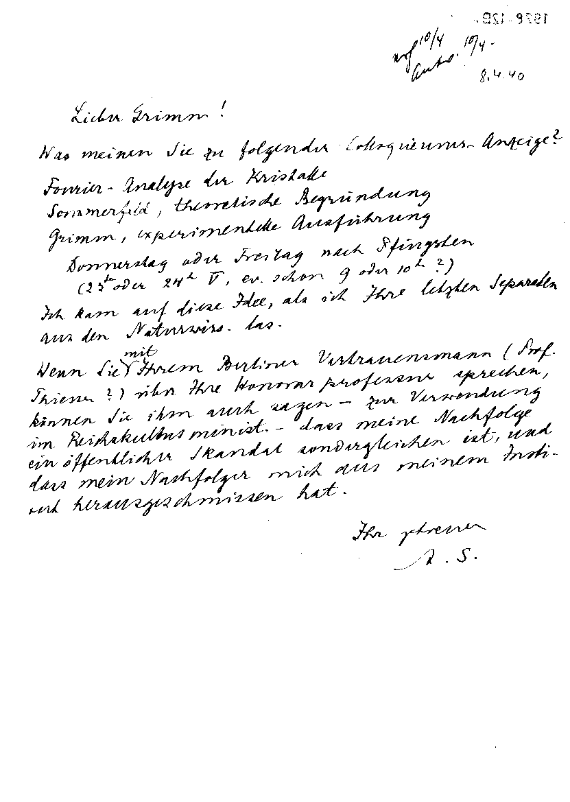 Arnold Sommerfeld an Hans Georg Grimm, Hedwig Grimm, 8. April 1940
