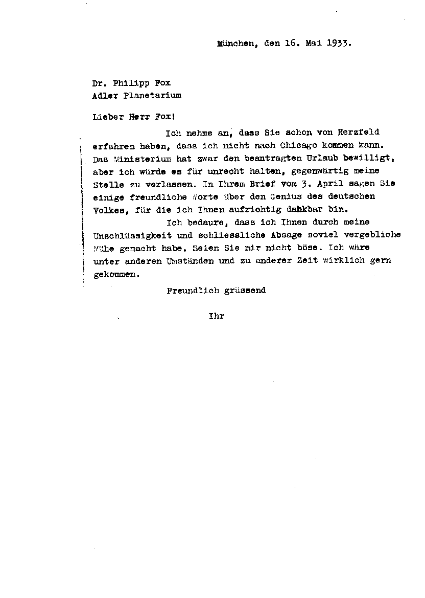 Arnold Sommerfeld an Philip Fox, 16. Mai 1933