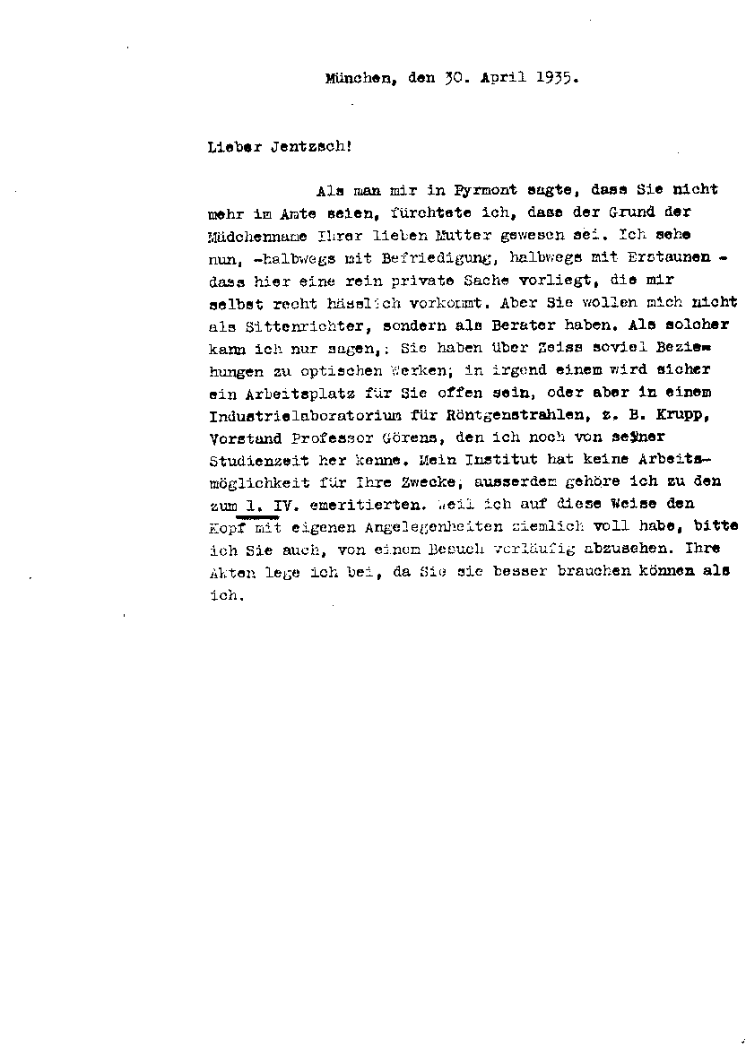 Arnold Sommerfeld an Felix Jentzsch, 30. April 1935