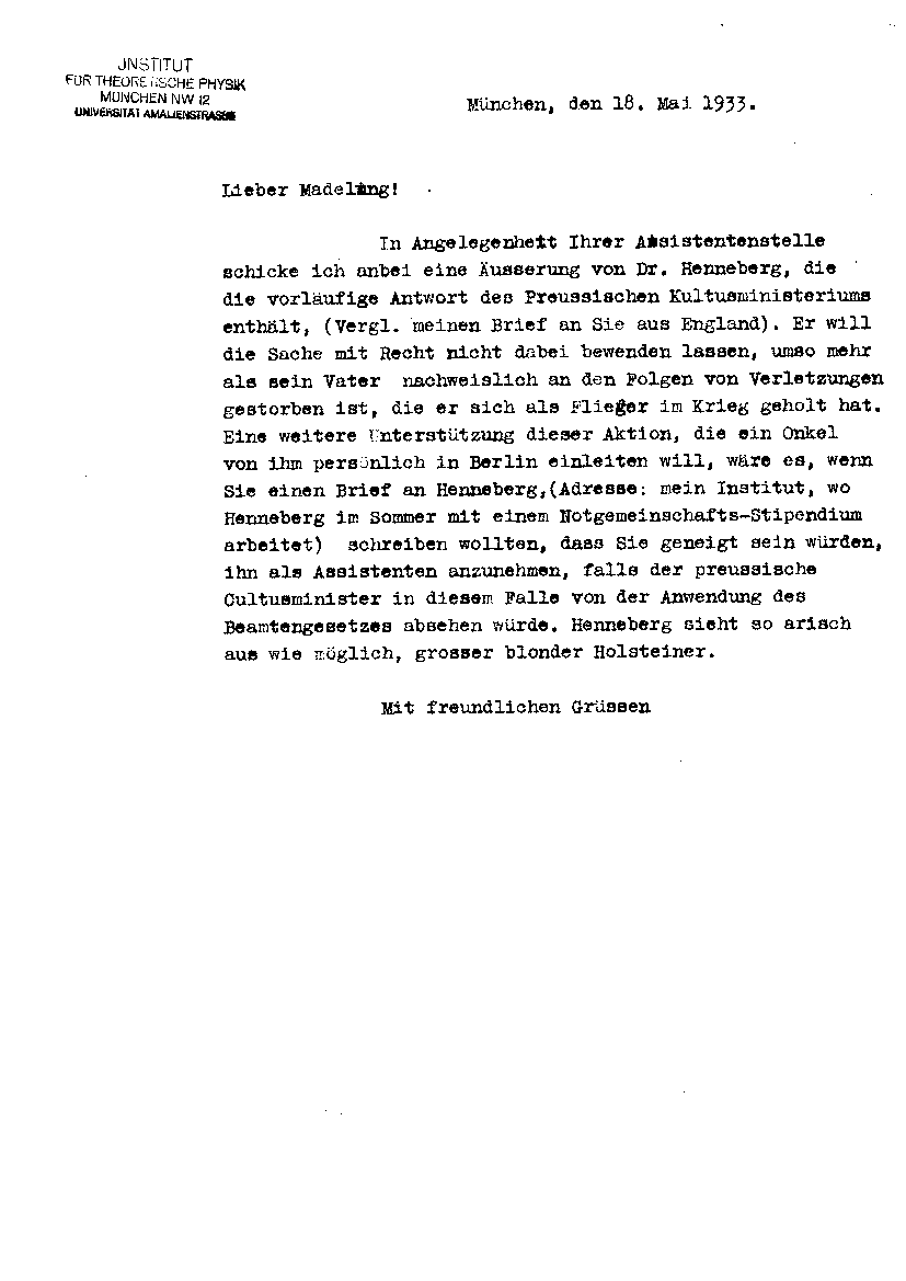 Arnold Sommerfeld an Erwin Madelung, 18. Mai 1933