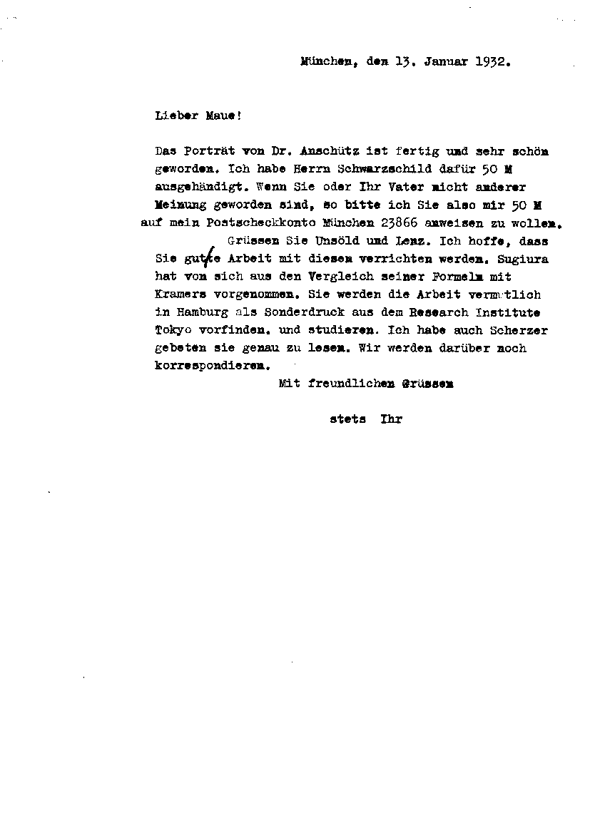 Arnold Sommerfeld an August Wilhelm Maue, 13. Januar 1932