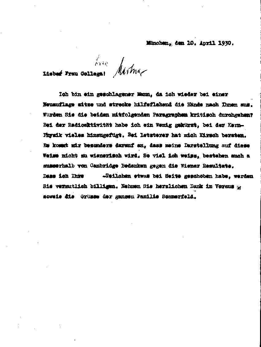 Arnold Sommerfeld an Lise Meitner, 10. April 1930