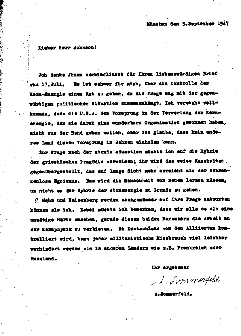 Arnold Sommerfeld an Oliver Johnson, 5. September 1947