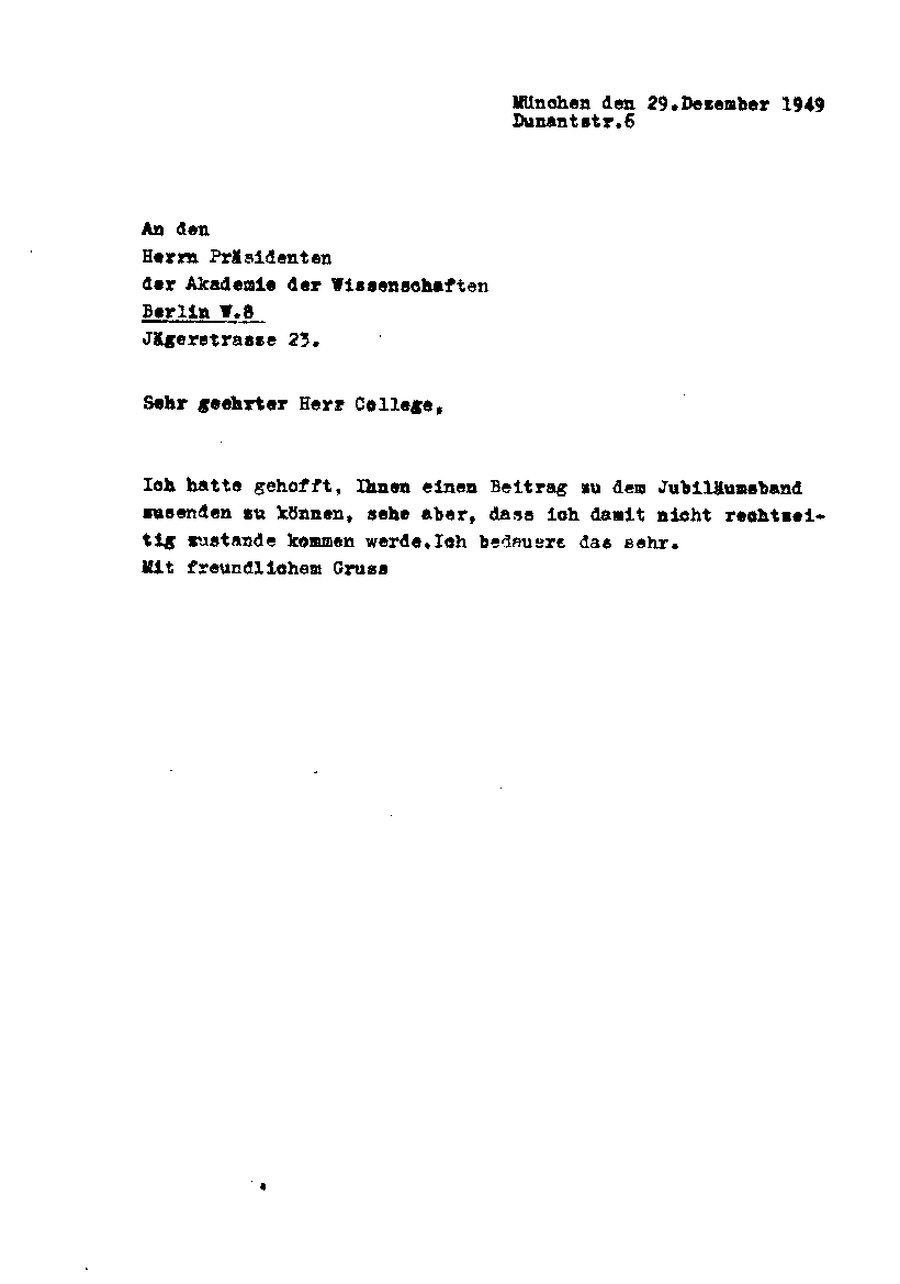 Arnold Sommerfeld an Berlin, Akademie, 29. Dezember 1949