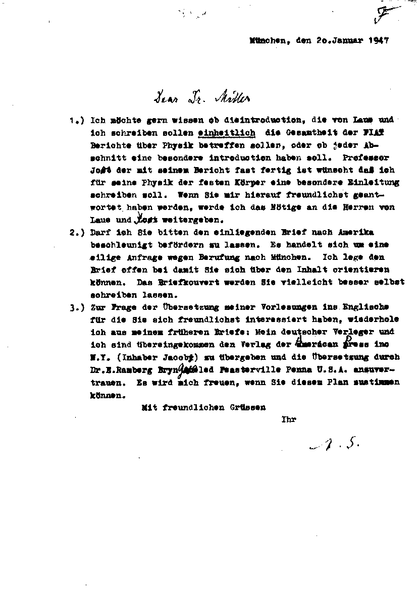 Arnold Sommerfeld an Matthew W. Miller, 20. Januar 1947