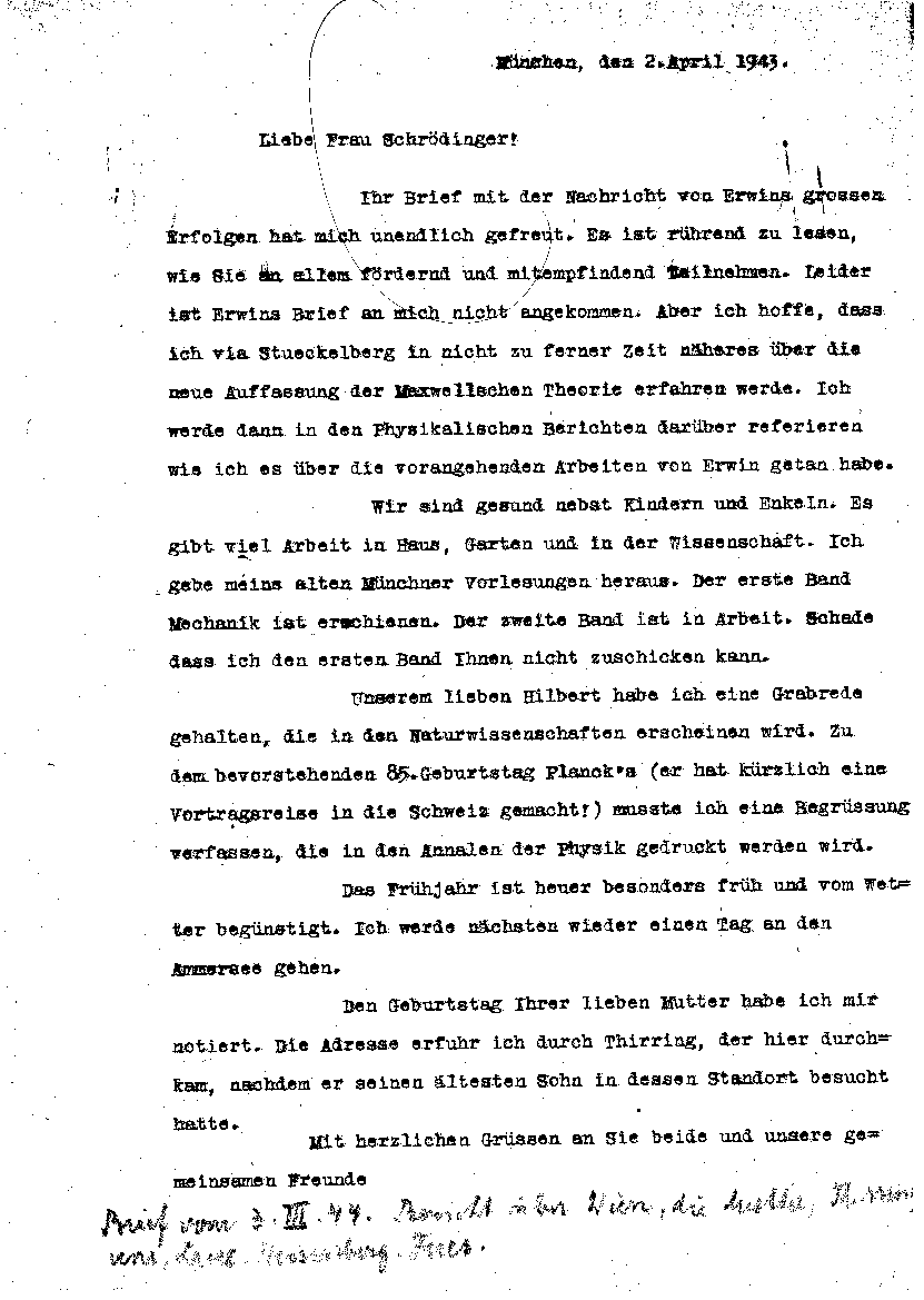 Arnold Sommerfeld an Annemarie Schrödinger, 2. April 1943
