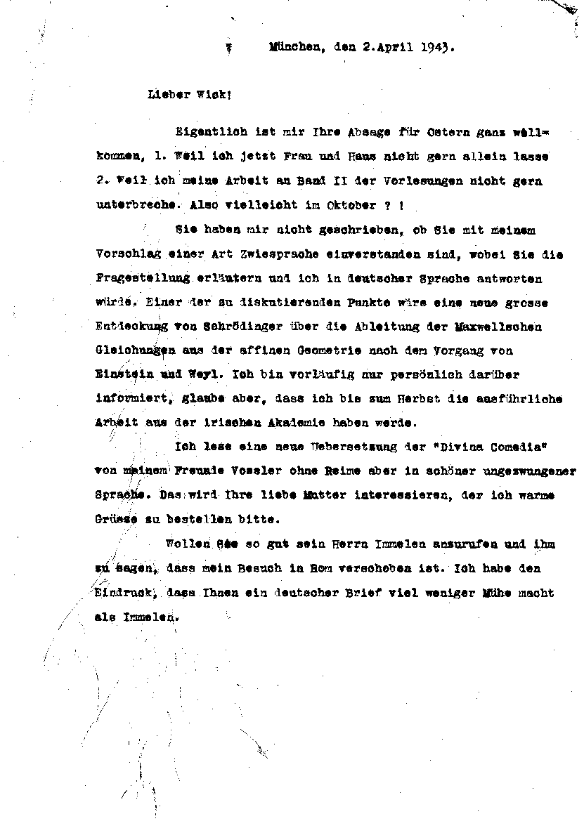 Arnold Sommerfeld an Gian Carlo Wick, 2. April 1943