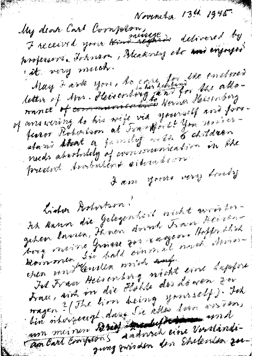 Arnold Sommerfeld an Howard P. Robertson, Karl T. Compton, 13. November 1945