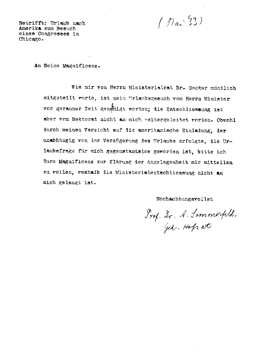 Arnold Sommerfeld an München, U, nach 13. Mai 1933