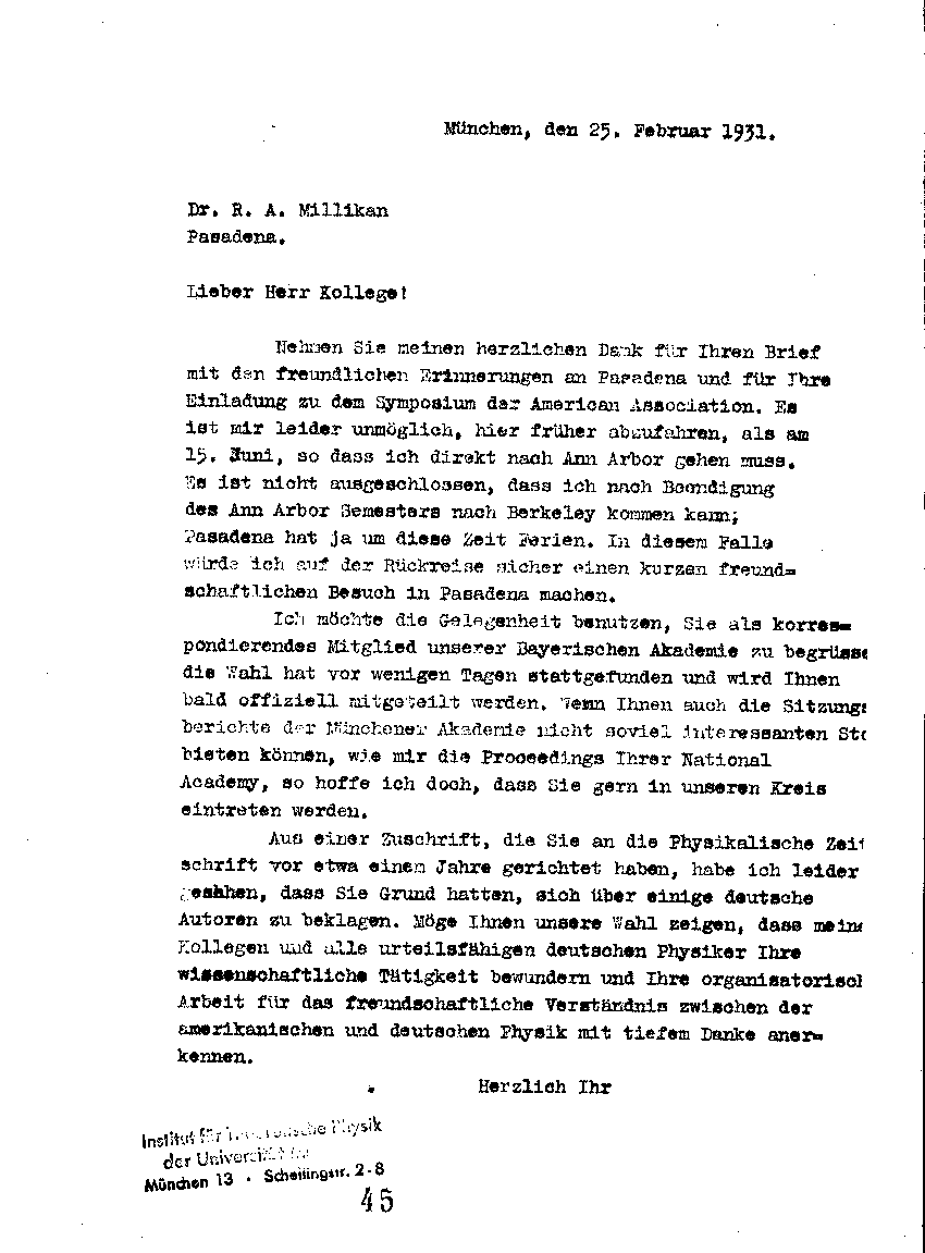 Arnold Sommerfeld an Robert A. Millikan, 25. Februar 1931