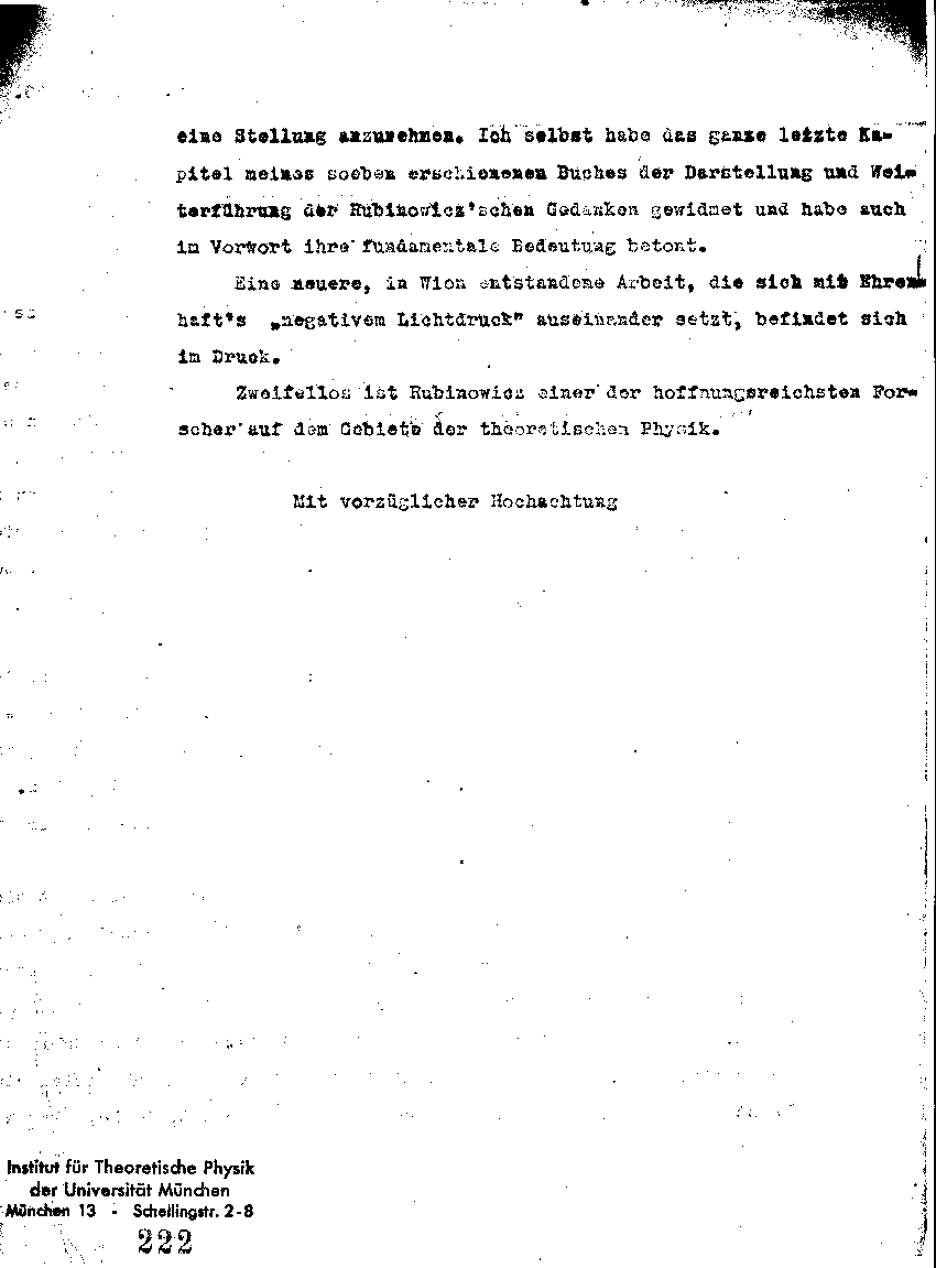 Empfehlungsschreiben für Rubinowicz auf einen Physiklehrstuhl in Laibach.