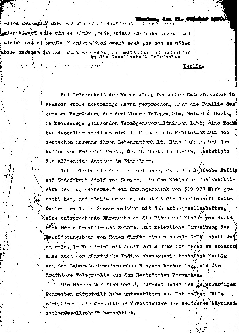 Arnold Sommerfeld an Telefunken, 22. Oktober 1920