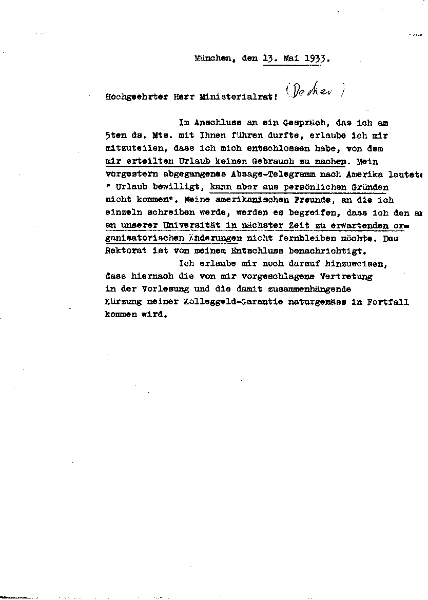 Arnold Sommerfeld an [Ministerialrat M 1933] Decker, 13. Mai 1933