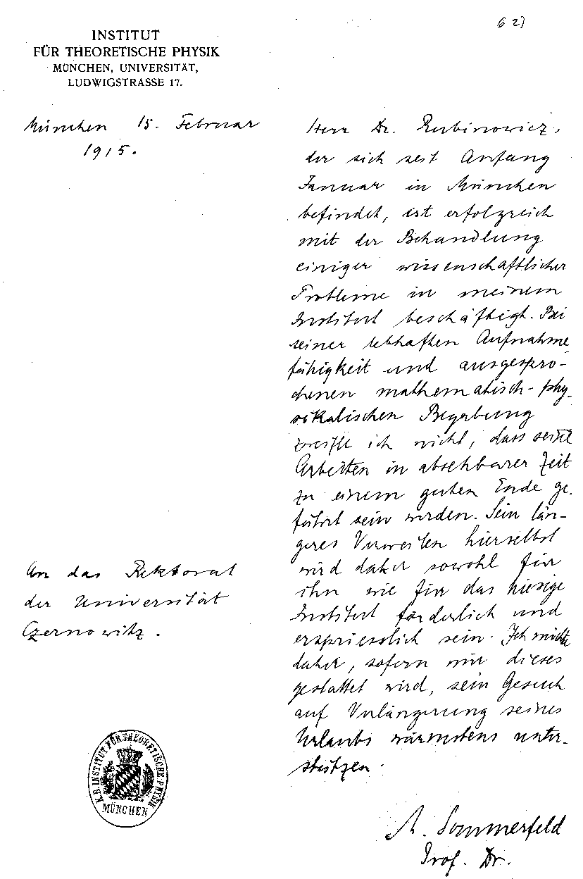 Arnold Sommerfeld an Czernowitz, U, 15. Februar 1915