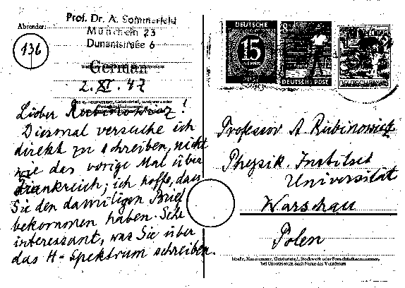 Arnold Sommerfeld an Adalbert Rubinowicz, 2. November 1947