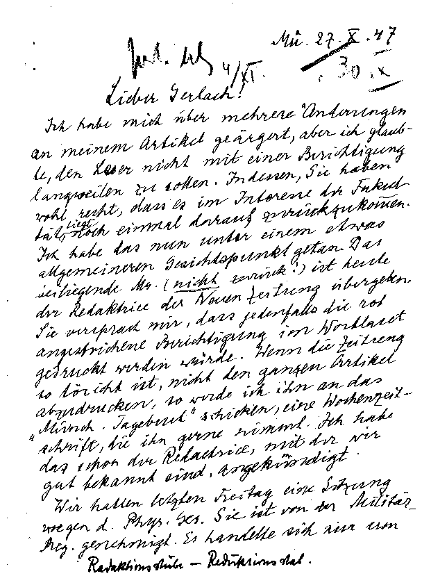 Arnold Sommerfeld an Walther Gerlach, 27. Oktober 1947