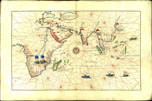 Ein weiteres Ausstellungsstück aus den Beständen des Universitätsarchivs ist eine nautische Portolankarte der östlichen Erdhalbkugel. Diese ist im Mitte des 16. Jahrhunderts erschienenen „Atlas universalis” des venezianischen Kartographen Battista Agnese enthalten.