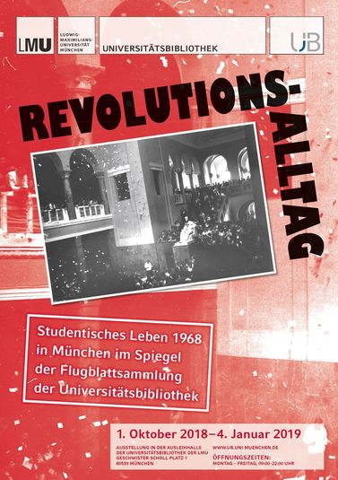 Ab dem 01.10.2018 ist in der Ausleihhalle der Universitätsbibliothek der LMU München die Ausstellung „Revolutionsalltag – Studentisches Leben 1968 in München im Spiegel der Flugblattsammlung der Universitätsbibliothek” zu sehen.
