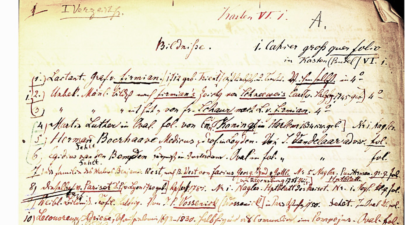 Abb. 1: Auszug aus dem „Bildnisse-Verzeichnis“ von ca. 1872. Angegeben ist der Dargestellte, der Vorlagen-Künstler, der Stecher und das Blattformat