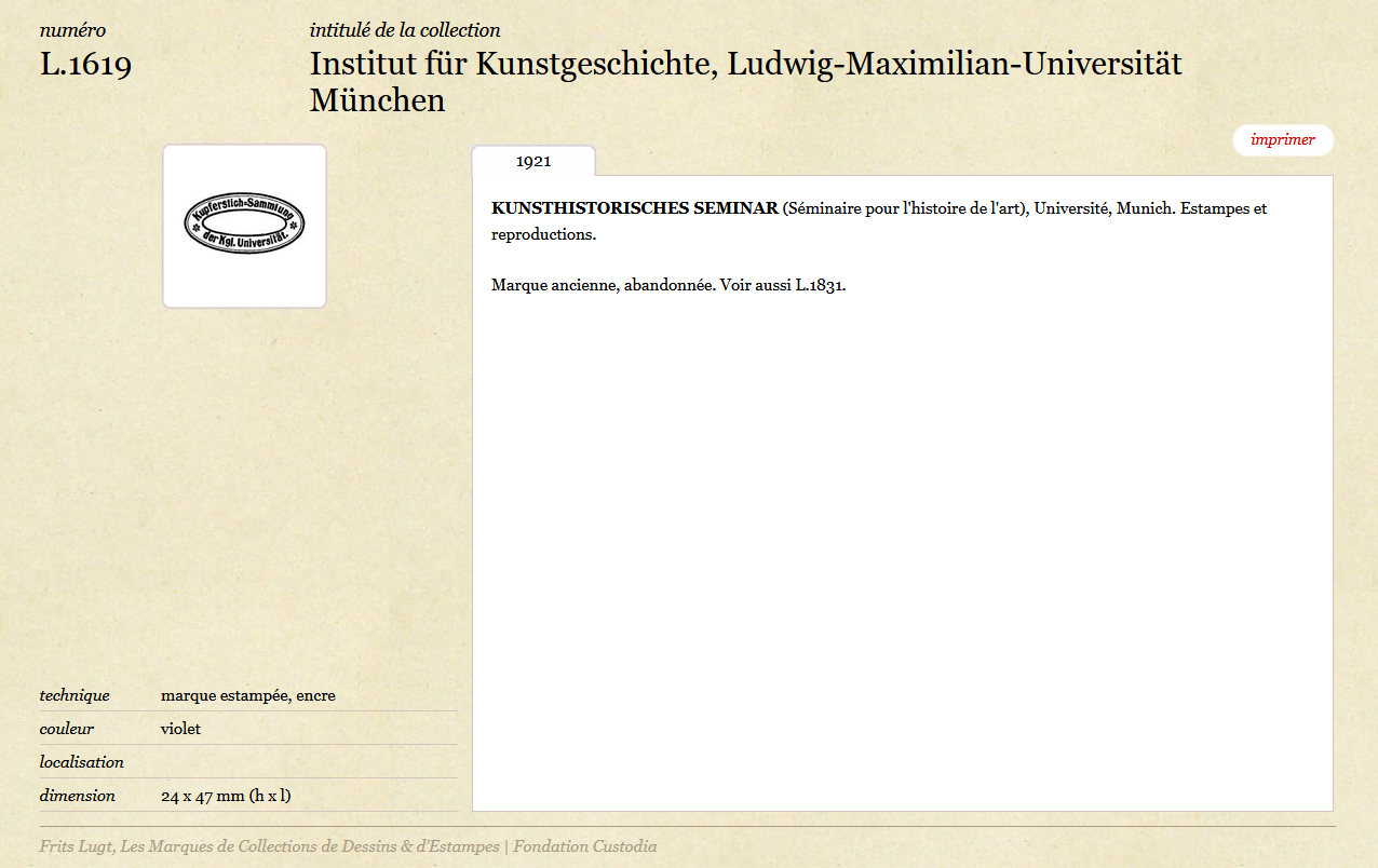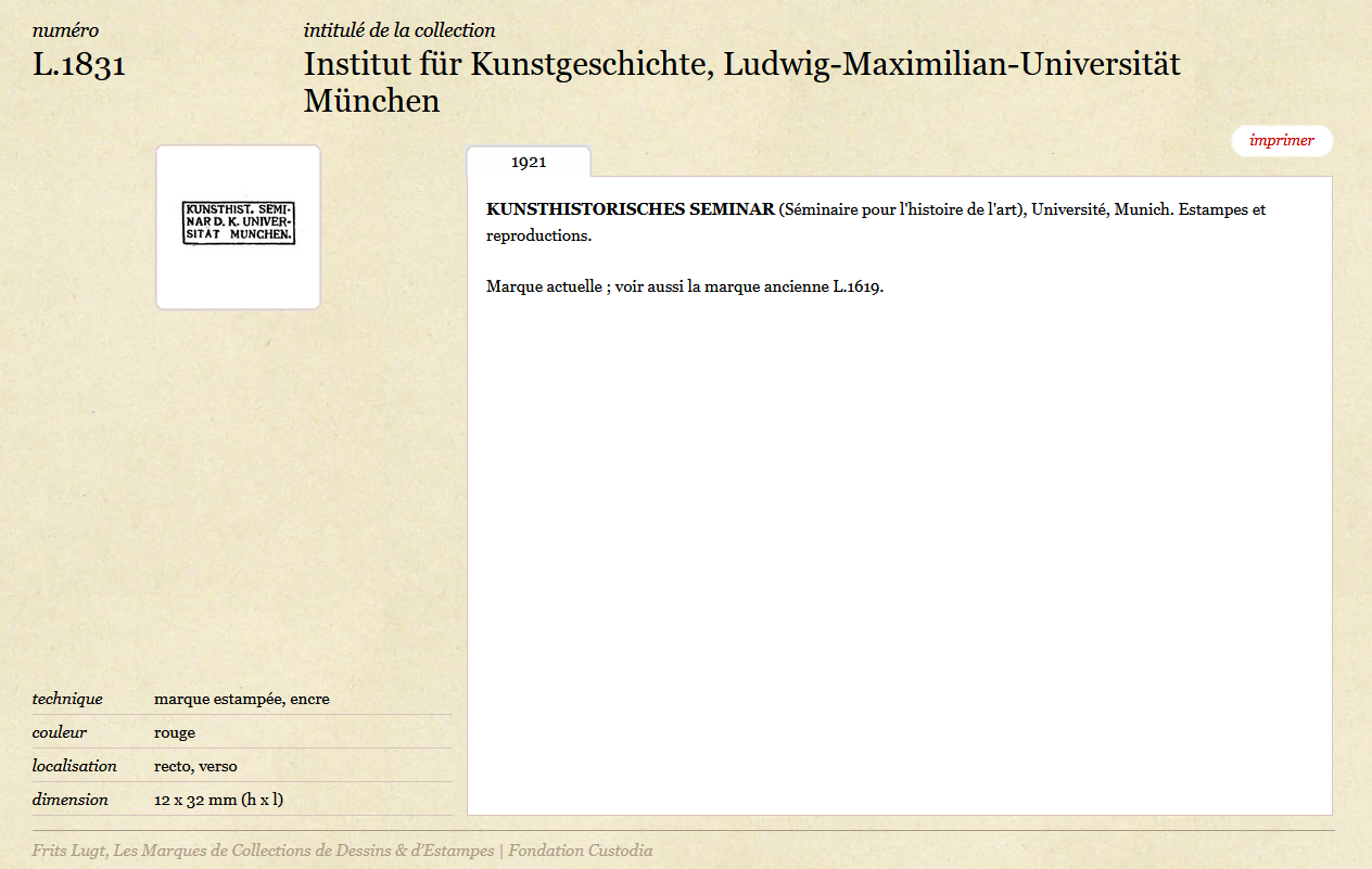 Damals für die Druckfassung, heute in der Datenbank, sind die Stempel, die in öffentlichen und privaten Sammlungen verwendet werden, mit Informationen zu deren Abmessungen, Farben, Technik und Platzierung auf den Blättern aufgenommen worden. Im Zuge der Aktualisierung der ersten Auflage im Jahr 1954 und der Digitalisierung im Jahr 2010 sind Präzisierungen, insbesondere zur Sammlungsgeschichte, hinzugefügt worden. Auch wenn die Einträge zur Grafischen Sammlung an der LMU noch sparsam bleiben, gehört ihre Ergänzung zu den weiteren Schritten, die bearbeitet werden. Die Aufnahme in der ersten Auflage der Marques de collections et d’estampes weist aber schon einerseits auf die damalige Bekanntheit der Sammlung über die Grenzen Deutschlands hinweg vor. Andererseits deutet es auch auf eine mögliche Zirkulation bestimmter Blätter zu voriger Zeit hin, die nacherforscht werden sollen.